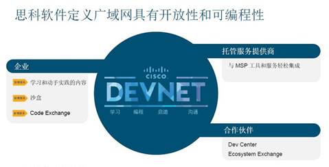除了提供卓越的安全和應(yīng)用體驗外,思科SD-WAN還具備開放性與可編程性。曹圖強表示,“首先,思科將通過 DevNet 開發(fā)平臺向所有用戶開放API,為開發(fā)人員提供更大價值;其次,對合作伙伴而言,思科希望提供一個可交互的平臺幫助用戶進行分享。任何用戶有特殊的需求,可以在DevNet 與大家分享。具體來說,在整個安全的廣域網(wǎng)部署中, IT人員可以通過開放的平臺,根據(jù)不同的環(huán)境和需求進行二次開發(fā)!